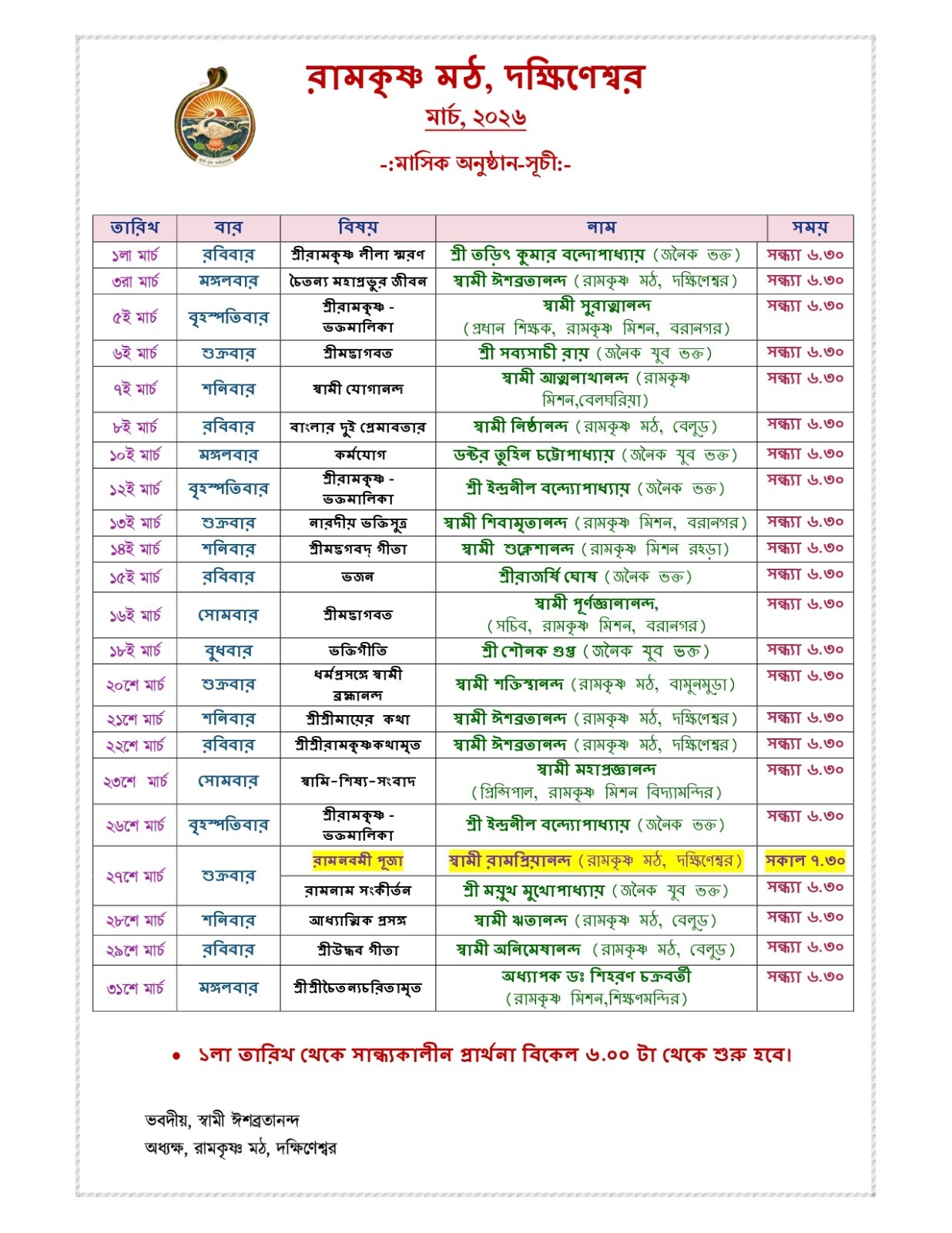 Monthly Programs : March 2026